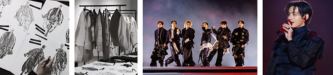 의상 또한 한국의 전통적인 복식 구조와 아름다움을 현대적으로 재해석하는 한국 대표 디자이너 송지오의 작품이었는데요. 각 멤버는 시인, 도령, 소리꾼 등을 테마로 조선시대 갑옷과 한복, 선비의 실루엣 등을 형상화한 맞춤 제작 의상을 착용하며 앨범의 메시지부터 공연이 이루어진 배경, 스타일링까지 하나의 유기적인 서사를 완성하였습니다. 이처럼 세심한 의도가 녹아 있는 복장에는 한국 산수화의 붓 자국 느낌을 그려낸 원단도 사용되며 한국만의 미학을 한껏 드러내고자 하였다고 하죠.😌