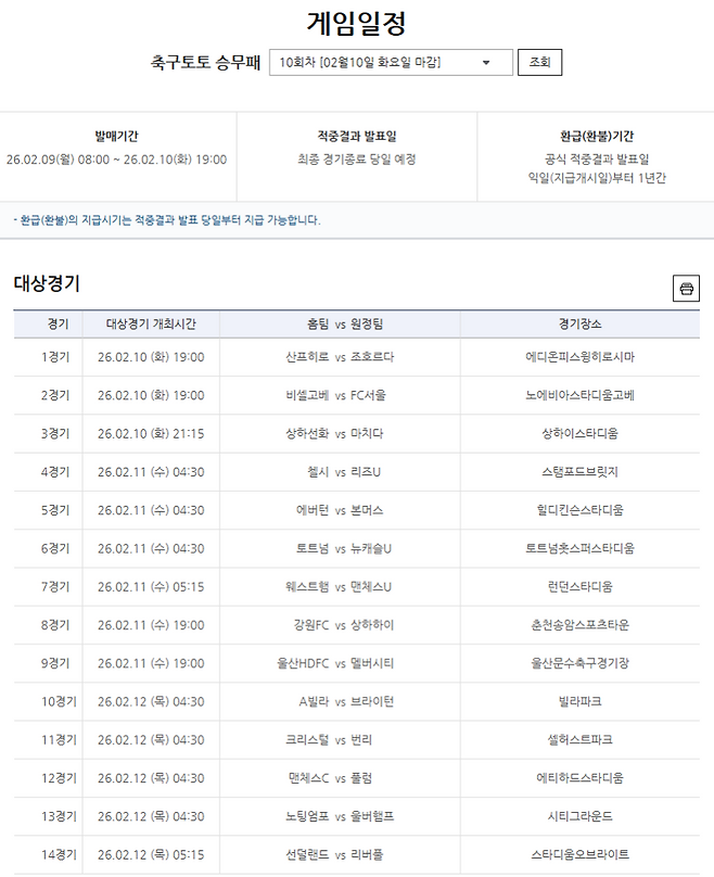 한편, 축구토토 승무패 10회차는 2월 9일 오전 8시부터 발매를 개시해 2월 10일 오후 7시까지 구매할 수 있다.