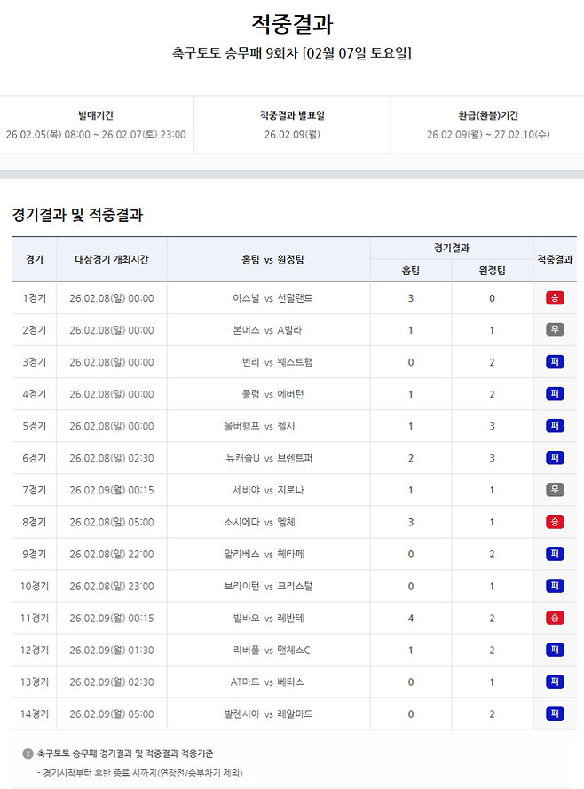 축구토토 승무패 9회차에서 선정된 14경기의 결과는 승(홈팀 승) 3경기, 무(무승부) 2경기, 패(원정팀 승) 9경기로 나타났다.