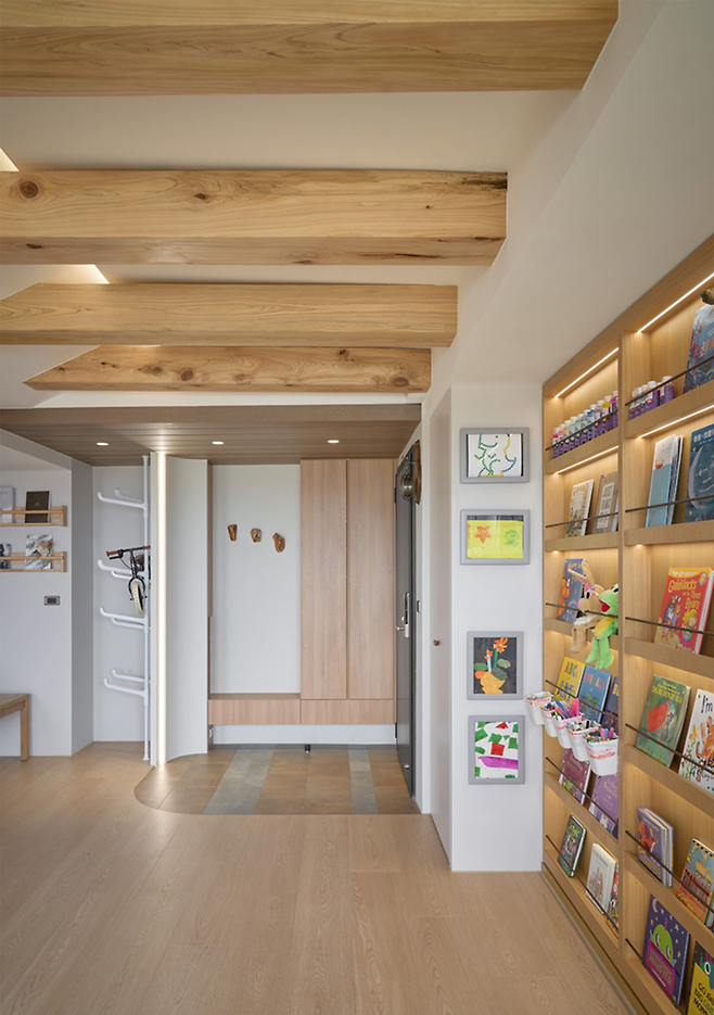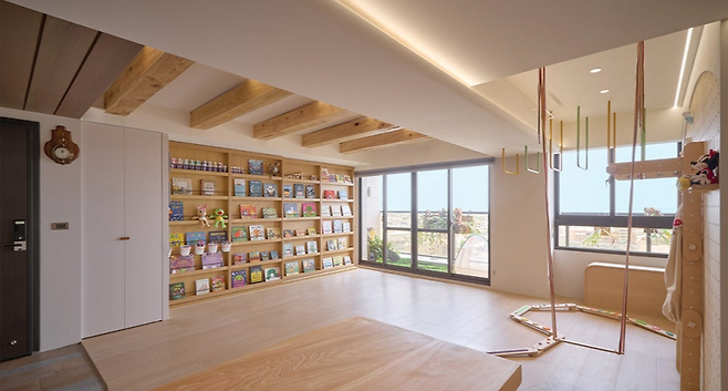 키즈카페 같은 거실은 이상적이지만, 현실은 층간소음이라는 민감한 문제가 따라오죠. 이 집은 그러한 문제를 미리 염두에 두고 흡음 자재, 방음 마루, 그리고 놀이 동선을 분산시키는 배치를 활용해 해법을 제시했어요. 부모와 아이가 생활 규칙을 정해 실내에서 지켜야 할 ‘조용한 시간’을 함께 익히는 것도 소음 방지의 중요한 포인트입니다. 아이도 이웃도 편안한 공존을 위한 작은 배려들이 모여 있죠.