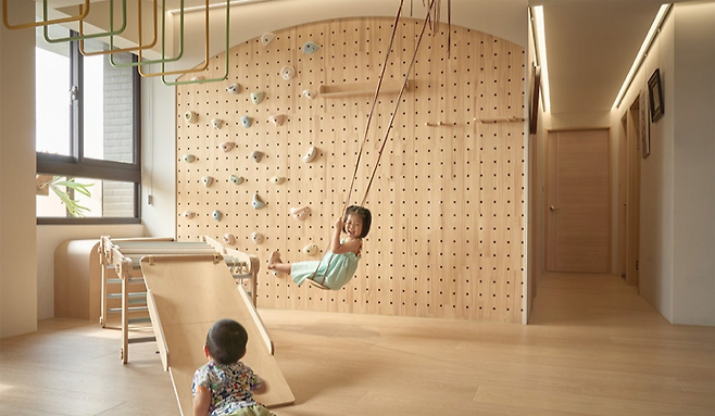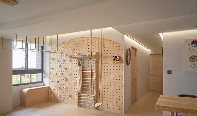 벽면엔 클라이밍 홀드, 천장엔 철봉과 그네, 바닥에는 단차 없이 연결된 마루. 집 안 모든 면이 아이의 움직임을 고려한 놀이터로 설계됐어요. 입체적인 구성 덕분에 아이는 한정된 공간에서도 다양한 동작을 익히고, 균형감과 근력을 자연스럽게 키워갈 수 있죠. 게다가 나무와 패브릭 소재를 조합해 안전성과 따뜻함까지 더했기에 실내에서 마음껏 뛰놀 수 있는 유아용 홈짐으로도 손색없어요.