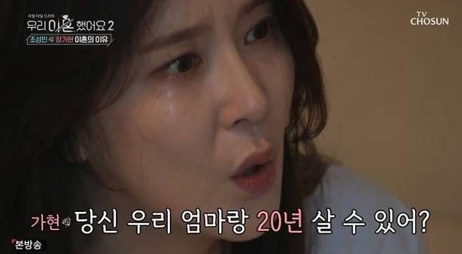 조성민이 전 시어머니 이야기를 꺼내자, 장가현은 “당신은 우리 엄마랑 20년 살 수 있어? 1년 같이 살면서 우리 엄마에게 어떻게 했는지 기억이나 나?”라고 외치며 감정을 폭발했다. 이 과정에서 장가현은 조성민을 밀치기도 했으며, 이로 인해 과거 공황장애를 겪으며 겪었던 고통스러운 경험까지 털어놨다.