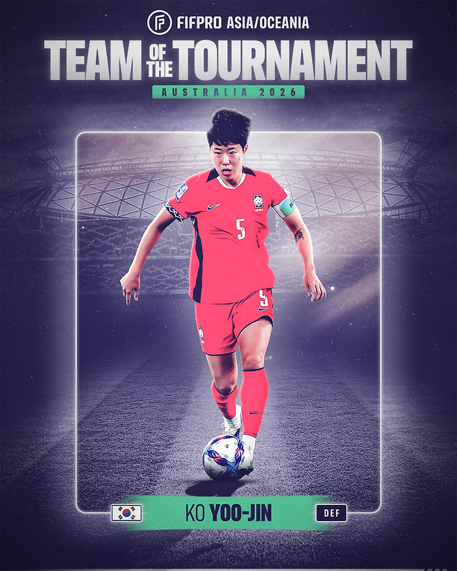 [골닷컴] 강동훈 기자 = 국제축구선수협회(FIFPRO) 아시아·오세아니아가 1일(한국시간) 2026 호주 여자 아시안컵에 참가한 선수들이 직접 투표한 베스트11을 발표했다. 한국에선 고유진(인천 현대제철)이 유일하게 베스트11에 이름을 올렸다.