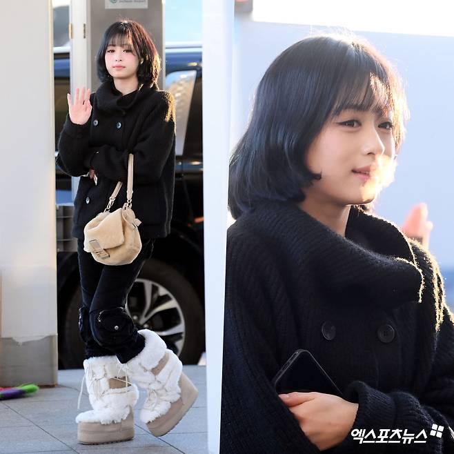 이날 아현의 공항패션은 겨울 무드를 포근하게 끌어올린 아이템(퍼 부츠와 백)이 포인트다. 블랙 니트 카디건과 슬림한 블랙 팬츠로 전체 실루엣을 깔끔하게 정리하고, 내추럴한 단발 헤어로 담백한 분위기를 더했다. 과한 장식 없이도 차분한 컬러 매치로 시선을 모으는, 미니멀한 공항패션의 정석을 보여줬다.