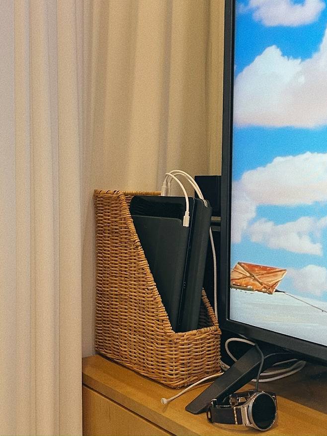그래서 이케아 라탄 서류함을 사서 노트북이라 아이패드를 거치하고 항상 충전 잭을 연결시켜놨어요. 이렇게 하면 가구들 통일성도 유지하면서 배터리가 떨어져서 당장 사용할 때 당황하는 일이 없더라구요.