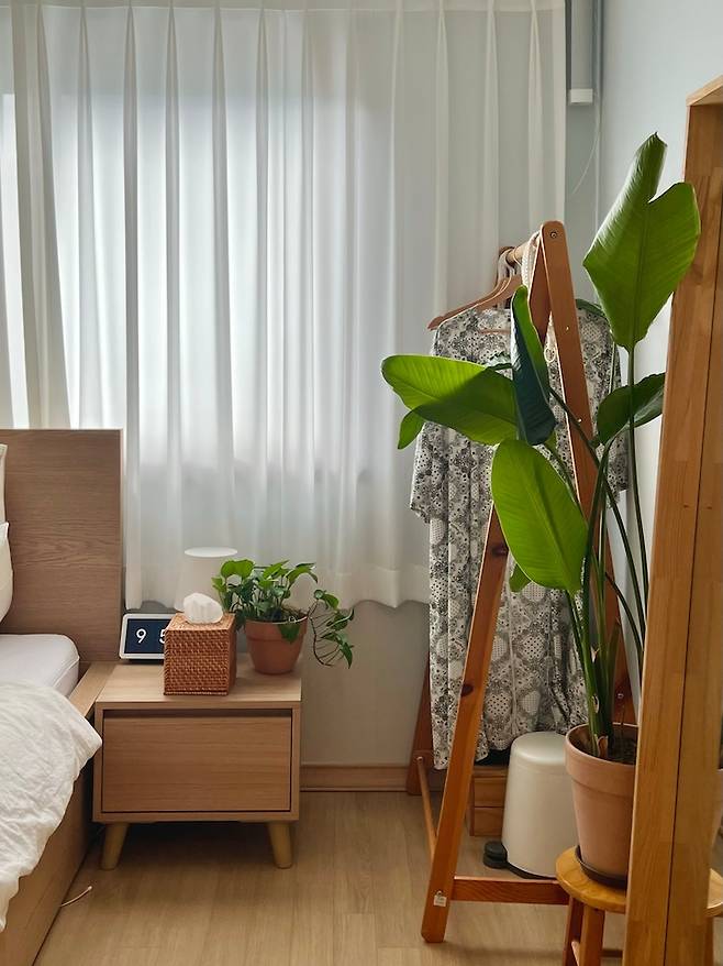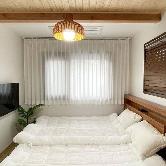모든 공간에 티비를 두기로 해서 티비를 기준으로 침대를 배치했어요. 커튼은 채광은 충분히 들어오지만, 밖에서는 비치지 않은 커튼을 찾았어요. 그래서 지금 커튼을 선택하게 됐고 빛은 충분히 들어오지만 집안에 사람의 모습은 비치지 않더라고요. 강력 추천하는 커튼입니다.