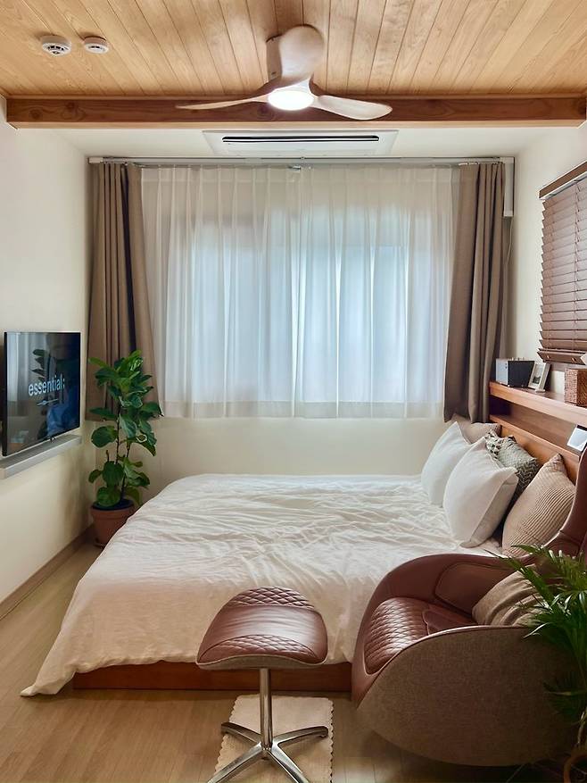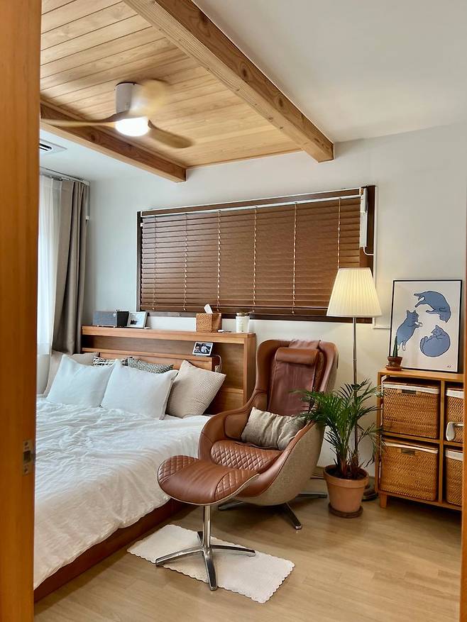 여름이 몇 해 겪고 나서 실링팬을 달게 되었어요. 안방의 천장은 편백나무로 마감되어 있어서 연결되는 느낌을 주려고 나무 실링팬을 선택했어요. 덕분에 산장 같은 감성이 됐지만 일반적이지 않은 것 같아서 좋아요.
