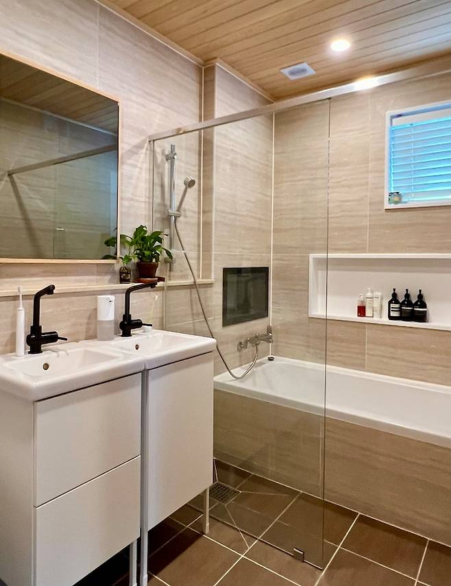 저희는 공간마다 티비가 있는게 좋아서 욕실에도 남편이 직접 티비를 만들어 주었어요. 그래서 반신욕을 즐기면서 좋아하는 프로그램을 보는 게를 겨울엔 큰 낙이에요.