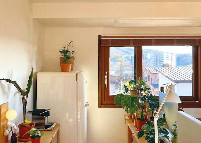 남편과 제 책상이 나란히 붙어있어요. 제 자리가 창문 바로 옆자리라서 4계절을 풍경을 즐기기 좋아요. 작업실은 앞쪽엔 미니 냉장고 (저희끼린 탕비실이라고 불러요.ㅎㅎ) 가운데는 부부 책상, 뒷편엔 수납공간이 있어요. 책상과 수납장에서 각자의 취향이 묻어나는 물건들을 채워놓았어요.