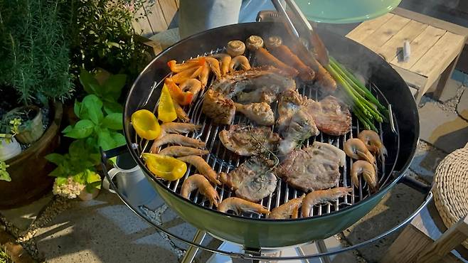 바베큐 파티, 모임은 앞마당 보다는 면적이 넓은 옆 마당에서 많이 해요. 꽃 보면서 먹는 고기는 꿀맛이랍니다.
