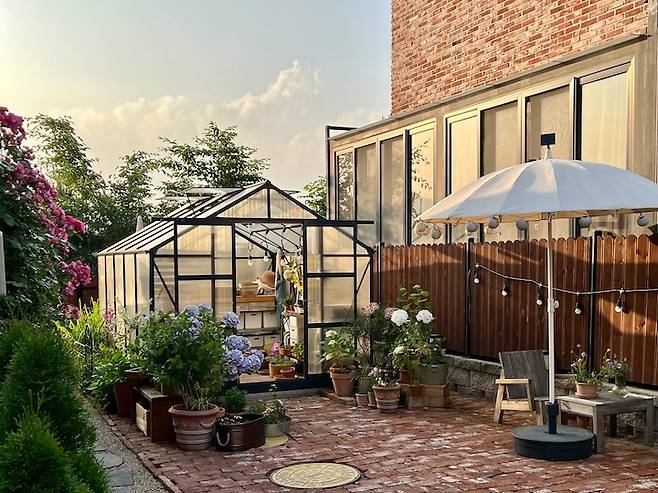 옆마당은 3평 짜리 미니 온실이 있고 바닥은 고벽돌로 깐 공간이에요. 12-1시 이후에는 집 그림자 덕분에 여름에는 앞마당보다 더 애용하게 되는 마당이에요.