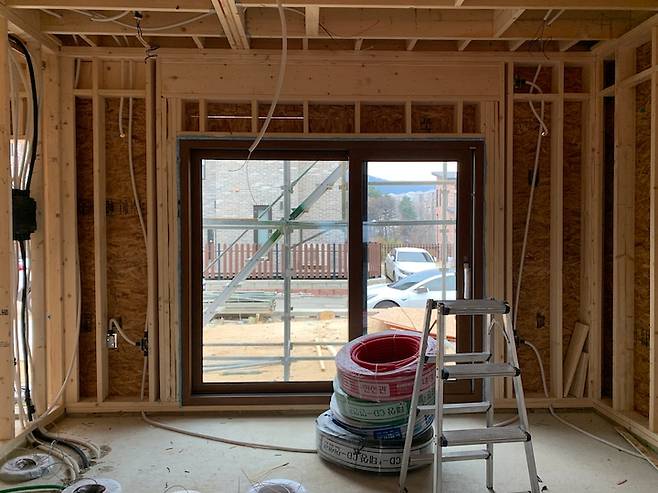 저희 집은 목조주택 건물이고, 120세대 타운하우스예요. 몇 가지 타입 중에 선택할 수 있었고 저희는 2식구 뿐이라 작은 타입을 선택하고 일부 확장 공사를 했어요. 거실에서 바라보는 모습이에요.지금은 황량해 보이지만 나중에 나무와 꽃을 심고 달라질 모습을 생각하니 너무 기대됐어요.