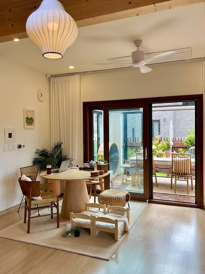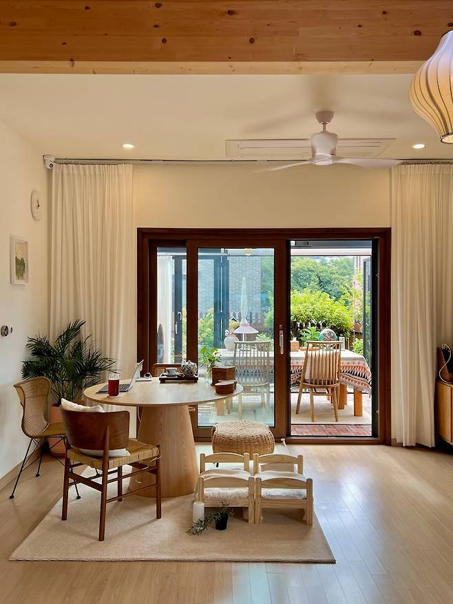 그리고 아주 넓지는 않지만 'ㄱ' 모양의 마당을 가지고 있어서, 해의 방향에 따라, 입맛에 맞춰 즐길 수 있는 장점이 있어요.부부 모두 재택 베이스로 근무하다 보니 많은 시간을 집에서 보내게 됐고 저희의 생활 패턴에 맞도록 구성하게 되었어요.