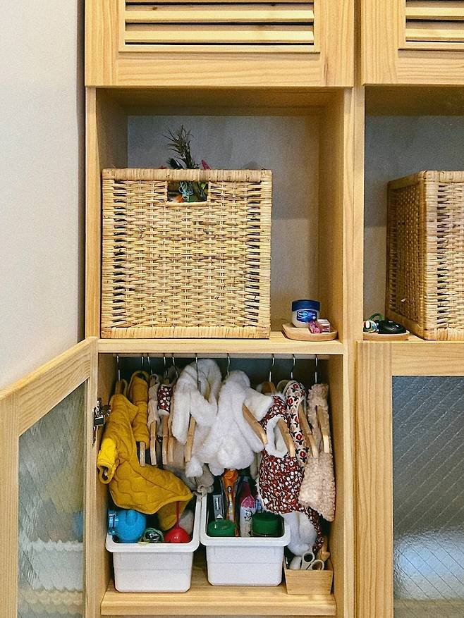 고양이 용품 쪽에는 고양이 옷장도 만들어뒀는데요, 목봉을 하나 사서 안에 고정해두고 작은 옷걸이를 사서 걸어두니 바로 귀염뽀짝한 옷장이 되더라구요.