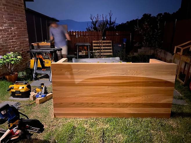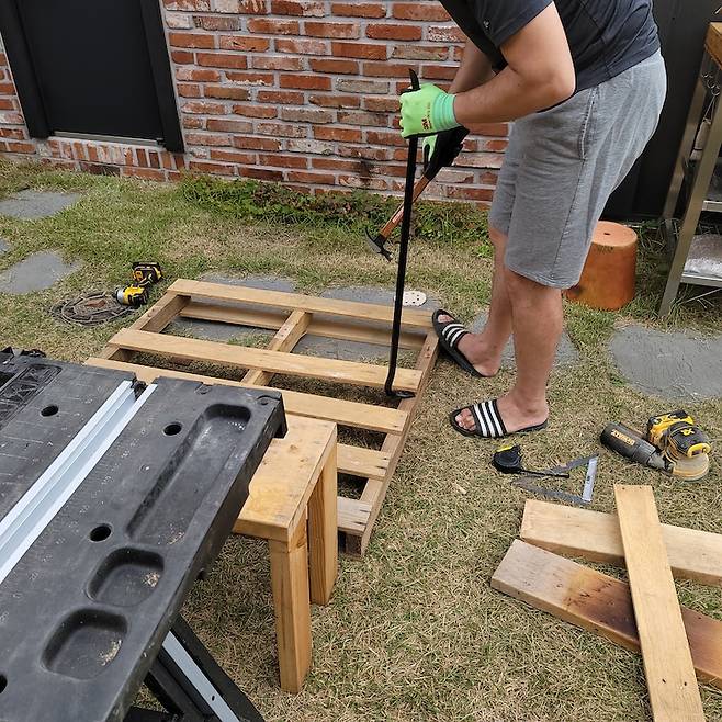 더 있었으면 좋겠다고 하니 남편이 나무 파레트를 주워와 의자 6개, 테이블 4개를 만들어줬죠. 현재는 앞마당의 메인 가구가 되었지요.