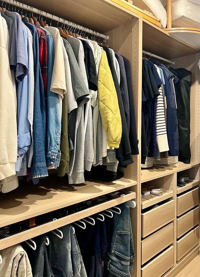 옷걸이는 모두 나무 옷걸이를 사용해요. 어깨도 늘어나지 않고 통일되어 보여서 좋더라구요.