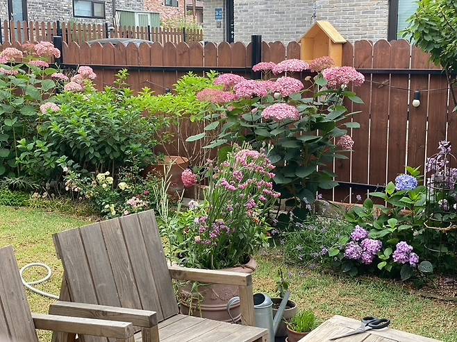 꽃중에 수국을 제일 좋아해서 수국을 많이 심었죠. 저의 매해 꽃 농사의 잘 되고, 못 됨의 기준은 수국이 얼마나 폈는지에 달렸어요. ㅎㅎ