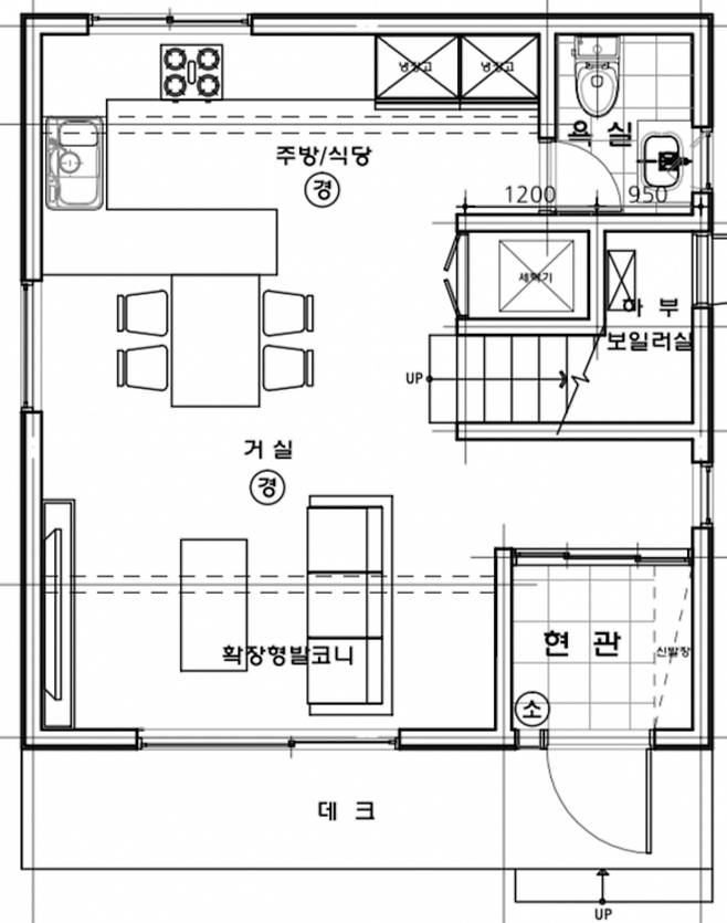 주방에 식탁이 있었을 때 모습이에요. 원래는 샷시 창으로 옆 데크를 드나들 수 있는게 기본 설계이지만, 저흰 큰 픽스 창을 만들어 풍경을 보는 걸 선택했어요. (큰 창으로 애버랜드가 멀리 보인답니다.)