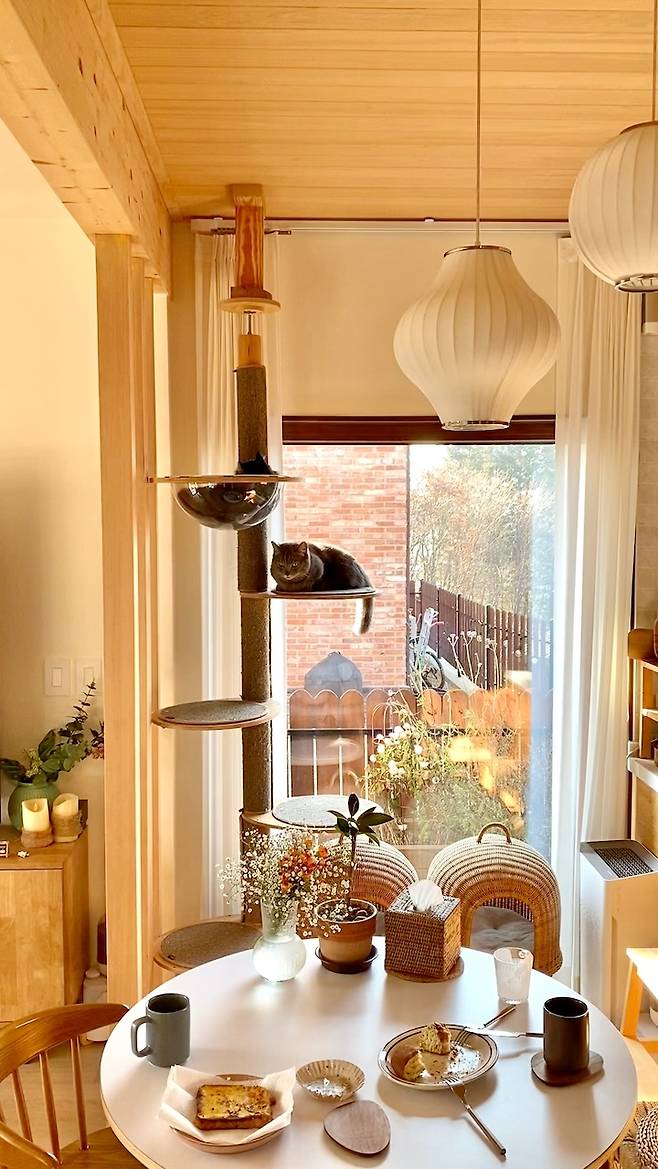 소파를 치우고 다이닝으로 쓰고 있는 모습이에요. 고양이들 기숙사도 만들어서 놔주었어요. 잘 쓰지는 않지만 가끔 써주면 왕 감동이랍니다.