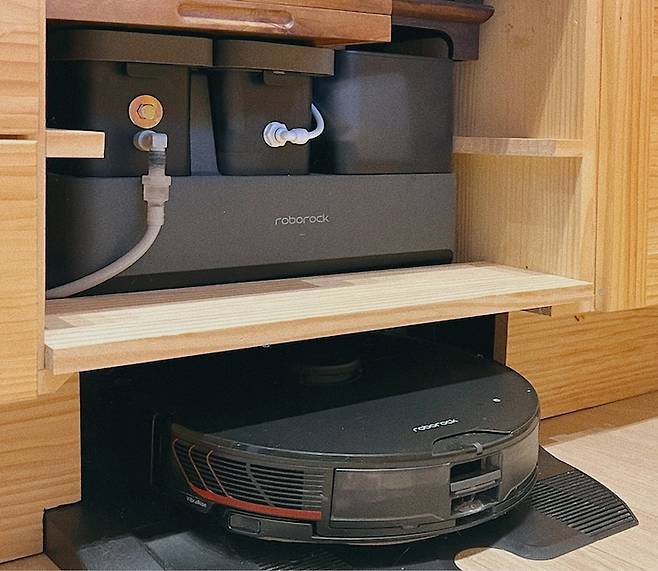 왼편 장 하단에는 남편이 개조해서 물걸레 로봇청소기가 들어가 있어요. 매일 아침 7시면 물걸레 청소를 해줘서 매우 편하게 사용하고 있어요. 금손 남편이 물걸레용 물도 따로 채우지 않고 자동으로 채워지게 개조해뒀어요.