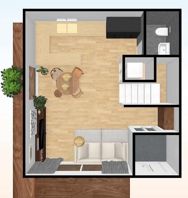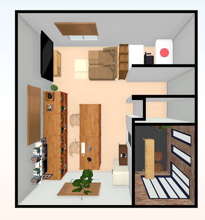 3층은 확장해서 4평의 공간을 추가로 생겼어요. 그래서 크게 쓰는 공간이 한 층은 있었으면 좋겠다는 생각에 포치 사이즈를 줄이고 실내를 늘렸어요. 대부분의 공간은 부부의 홈오피스로 쓰이고 아파트의 베란다 같은 개념의 포치, 남편의 게임방으로 구성되어 있어요.