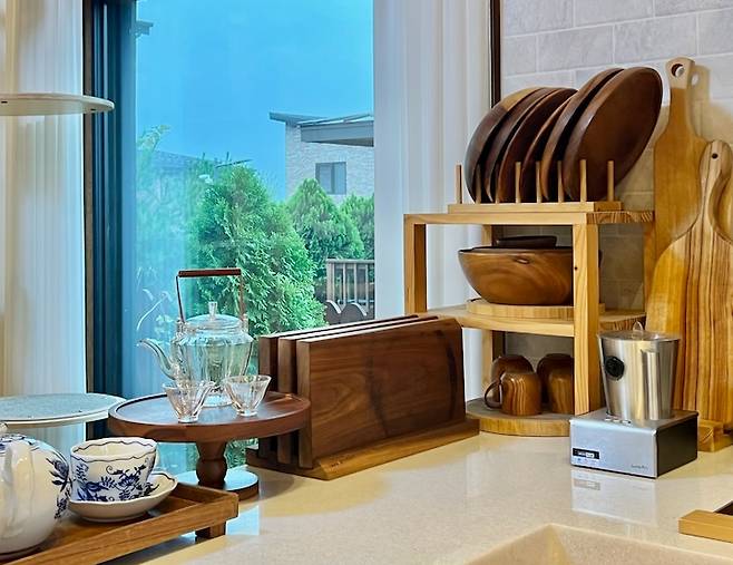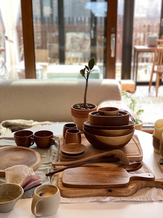나무 식기를 좋아해서 나무 도마, 그릇들이 많은 편이에요. 나무 식기는 식기세척기에 넣을 수 없고 상하기 전에 빨리 설거지를 해야하는 불편한 점이 존재하지만 나무에서 주는 분위기를 포기할 수 없더라구요.