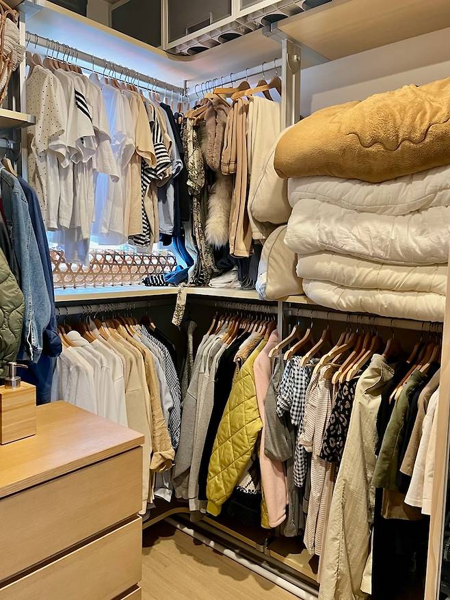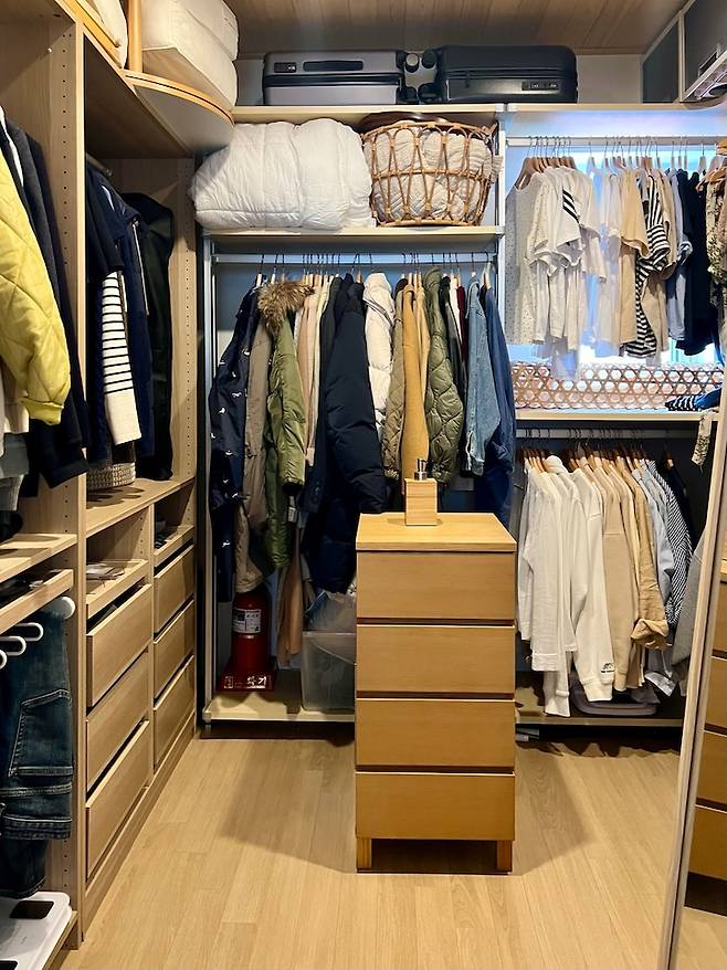옷방은 안방과 붙어 있고 역시나 크지 않아요. 하지만 2명의 4계절 옷과 안 쓰는 침구들까지 알차게 들어간답니다.