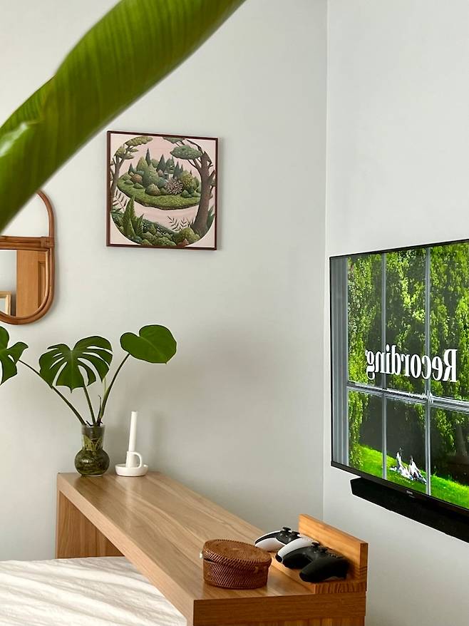 손님 방은 손님이 올 때도 쓰지만 큼지막한 티비를 걸어두어서, 가끔 플스 게임을 즐기거나 푹신한 곳에서 티비를 볼 수 있게끔 등받이 쿠션과 음료를 놓을 수 있도록 베드 테이블을 두었어요. 작지만 아늑하고 필요한 게 다 있어서 저도 가끔 손님방에서 자기도 한답니다.