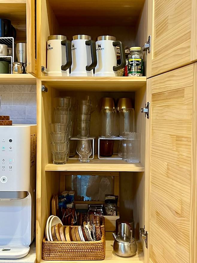 컵들도 정리 선반을 이용해 층을 나눴어요.