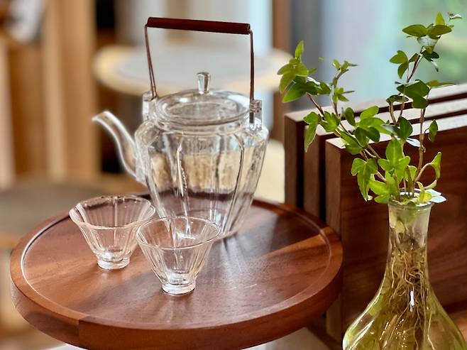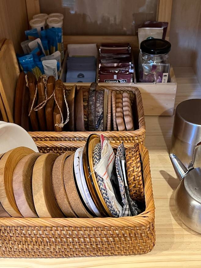 정수기 바로 옆 수납장은 컵을 바로 떠내기 쉽게 유리컵 공간이에요. 아랫단은 코스터 모으는 걸 좋아해서 코스터 모음과, 차를 골라 마실 수 있는 여러 종류를 차가 들어 있어요.