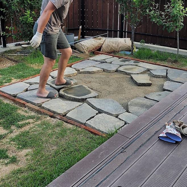 평탄화 디딤석 작업도 직접 하고, 정원과 잔디의 구분 작업도 직접 했는데, 모두 더운 날 해서 매우 힘들었지만 이제는 추억이 됐어요.