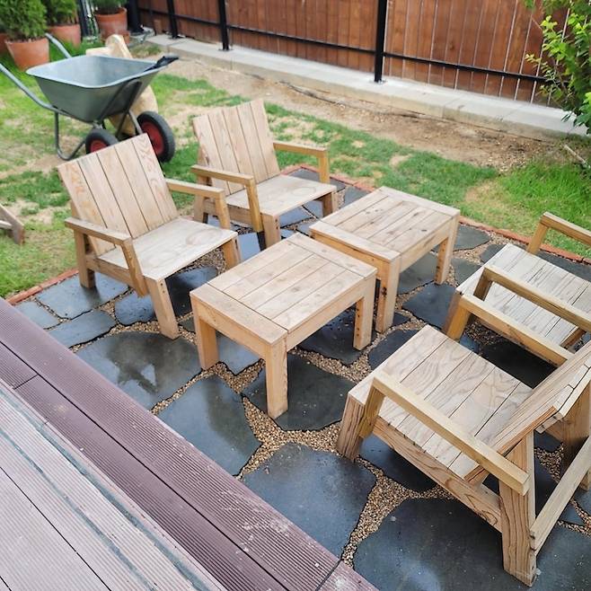 더 있었으면 좋겠다고 하니 남편이 나무 파레트를 주워와 의자 6개, 테이블 4개를 만들어줬죠. 현재는 앞마당의 메인 가구가 되었지요.