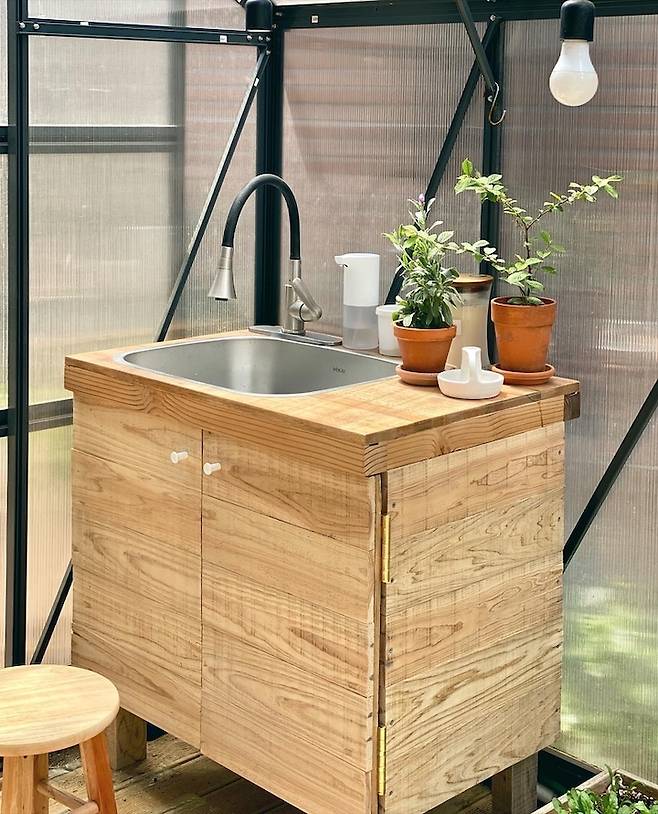 온실 안에 싱크대도 남은 목재로 남편이 만들어줬어요. 빈티지한 느낌이 너무 좋아요. 식물에 뿌리는 약 같은 자잘한 것들을 넣어놨어요.