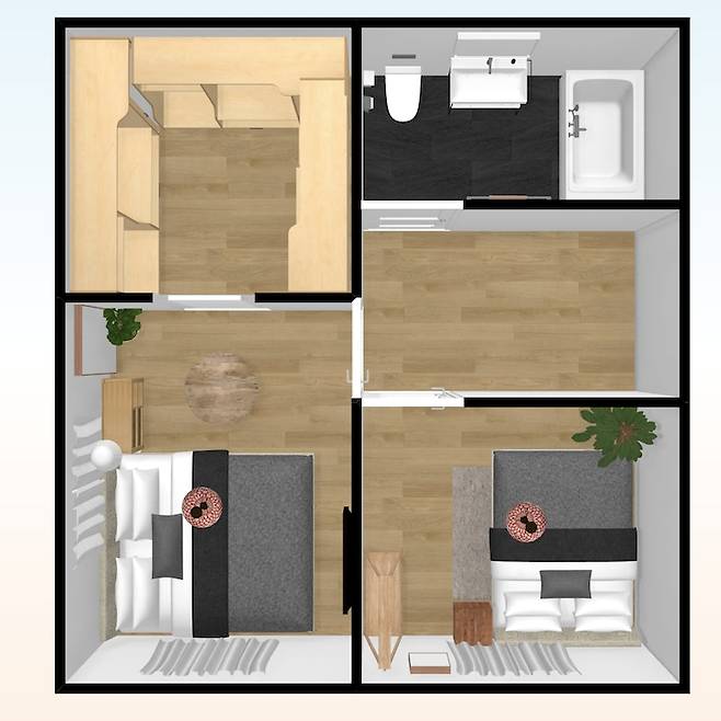 2층은 안방과 옷방, 손님방, 욕실로 구성되어 있어요. 작은 평수지만 참 알찬 구성의 공간이에요.