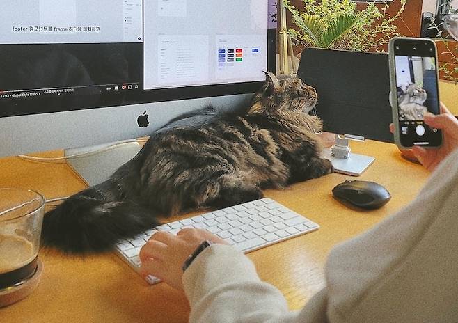 첫째 고양이는 꼭 제 컴 아래에서 참견하는 걸 좋아해요.