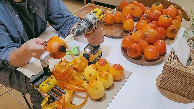 가을엔 남편과 곶감도 만들었어요. 감 깎기 귀찮았던 남편이 최첨단(?) 감 깎는 기계를 만들어서 쉽게 만들었답니다.