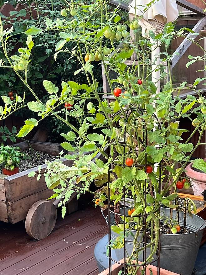 남편이 만들어준 꽃 수레에요. 실제로 나무 바퀴가 잘 굴러간답니다. 지금은 토마토를 심어놨어요.
