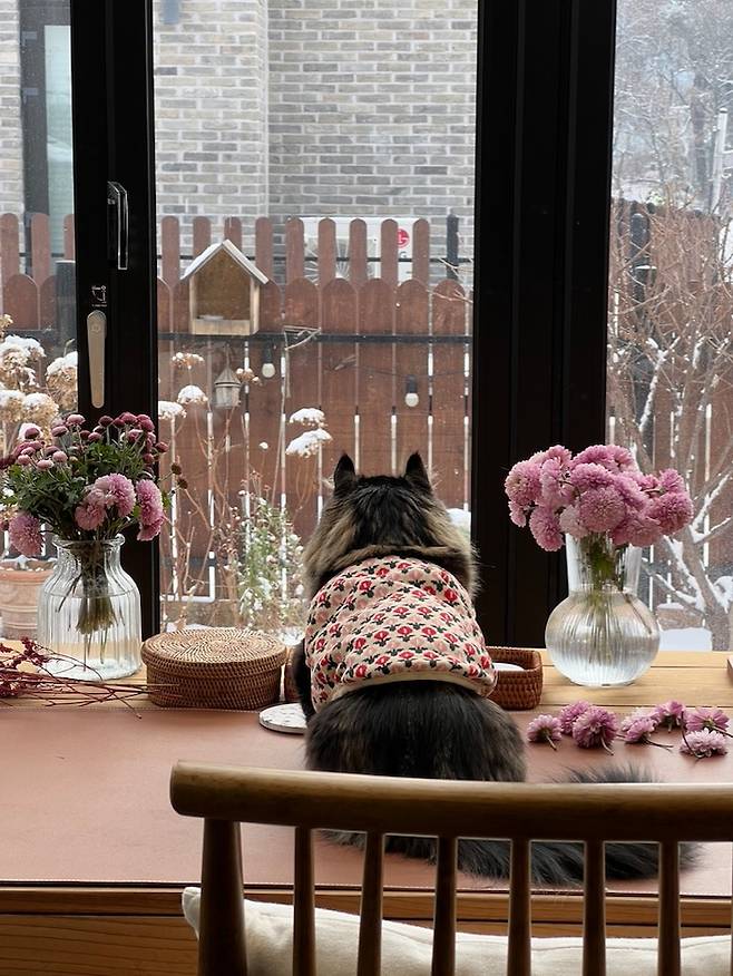 저희 집 냐옹이도 눈 구경을 좋아해요. 추우니까 옷 입고 구경하라고 조끼를 입었어요.