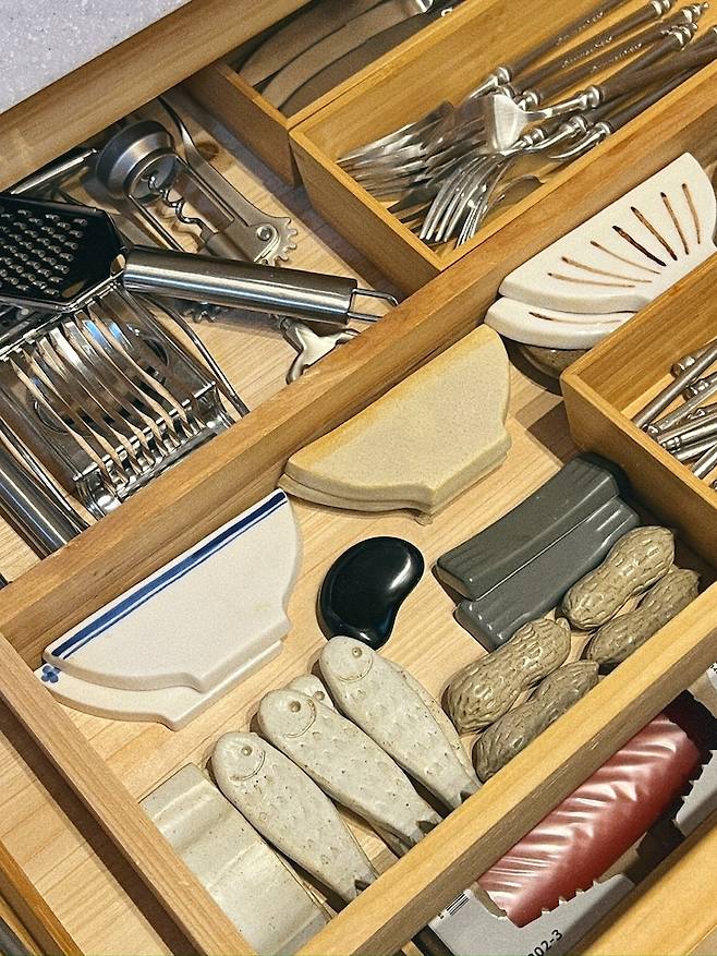서랍에는 통일된 게 좋아서 한 가지 스타일로 식기를 모두 맞췄구요, 직접 만들거나 선물 받거나 구입한 수저 받침대들이 들어있어요.