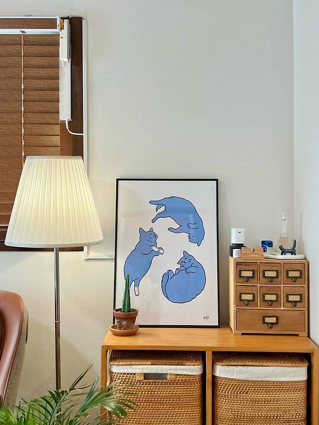 남편과 제 책상이 나란히 붙어있어요. 제 자리가 창문 바로 옆자리라서 4계절을 풍경을 즐기기 좋아요. 작업실은 앞쪽엔 미니 냉장고 (저희끼린 탕비실이라고 불러요.ㅎㅎ) 가운데는 부부 책상, 뒷편엔 수납공간이 있어요. 책상과 수납장에서 각자의 취향이 묻어나는 물건들을 채워놓았어요.