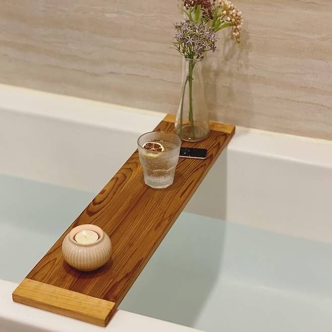 반신욕 할 때 이것저것 올려놓을 수 있는 거치대는 남편이 직접 만들어 주었어요.