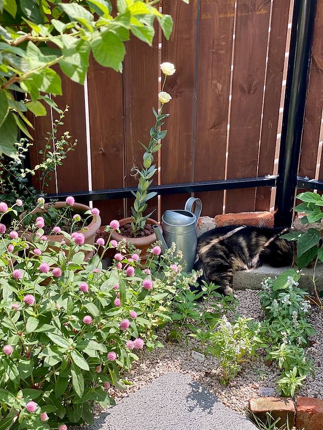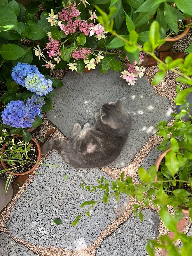 냐옹이들도 정원에서 낮잠을 자거나 시간을 많이 보내요.
