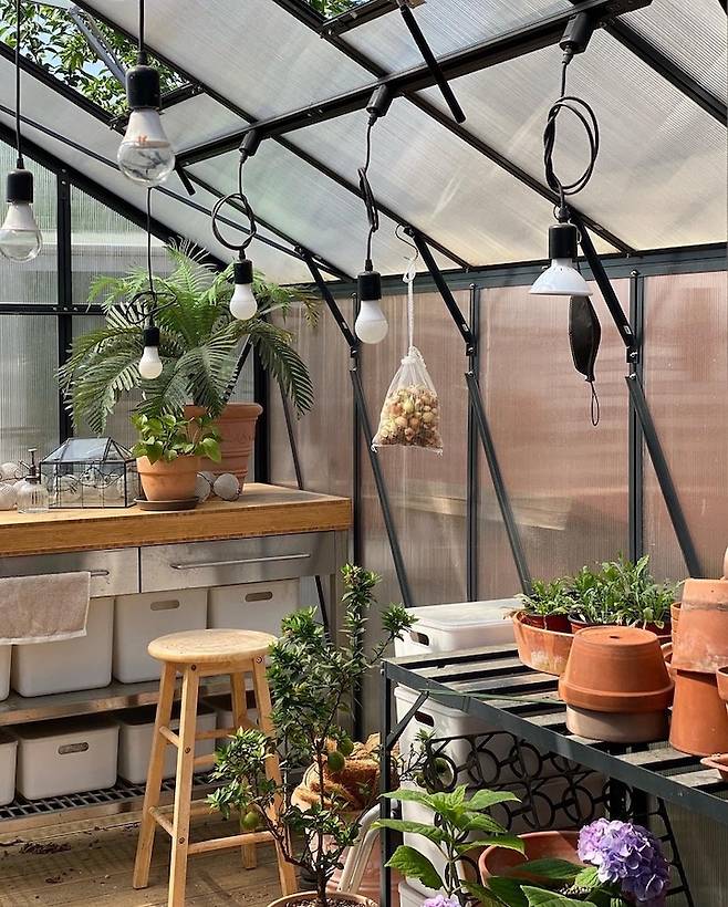 온실 안에는 가드닝에 필요한 용품과 월동이 끝난 식물들을 들여놔요.