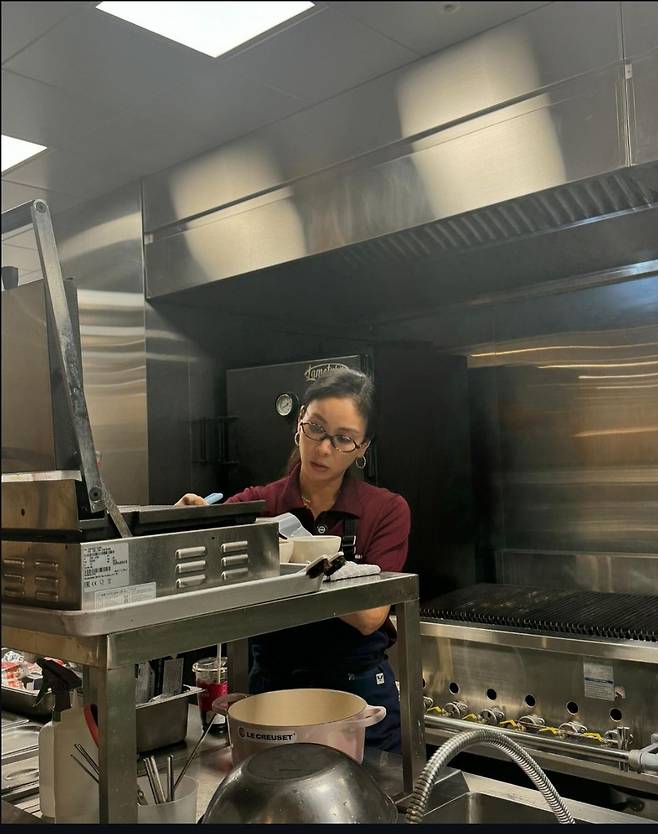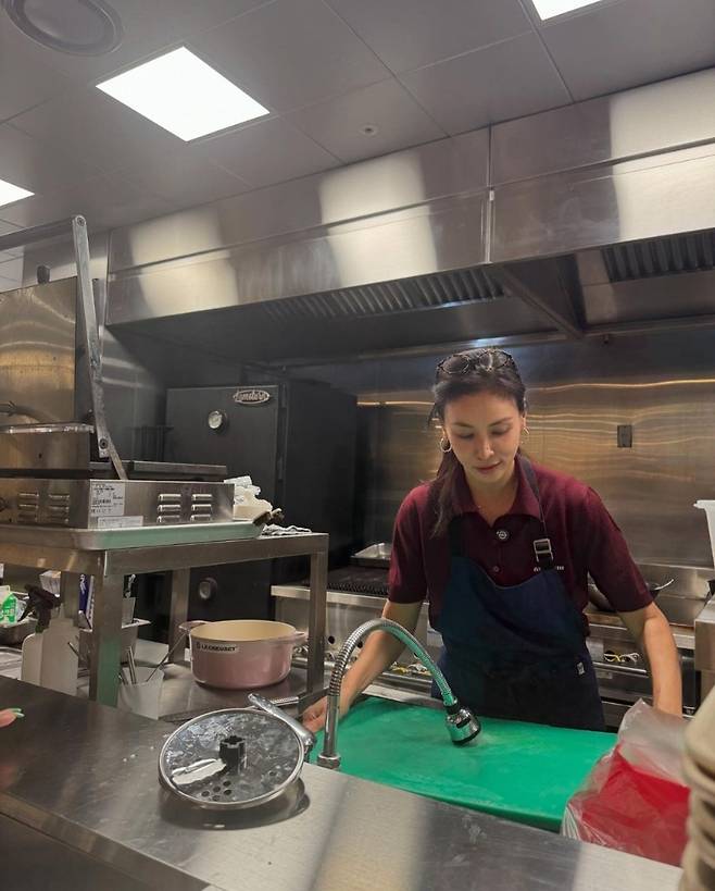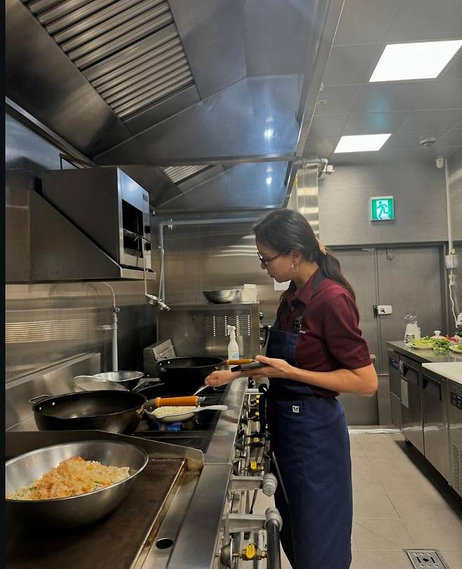 고소영은 버건디 컬러의 폴로셔츠에 네이비 앞치마를 착용해 요리하는 모습마저 우아함을 자아냈습니다.