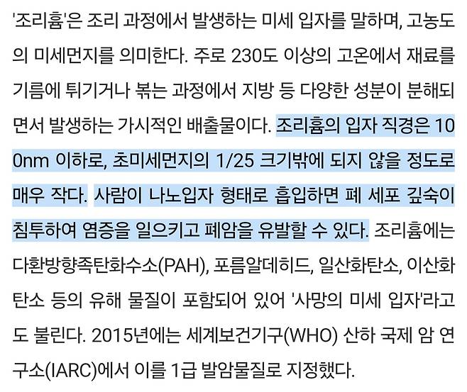 폐암 위험 때문에 조리흄 제거 마스크까지 따로 개발됐다고 하네요.