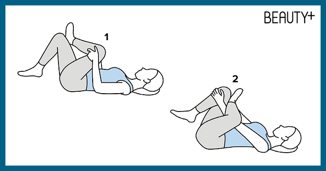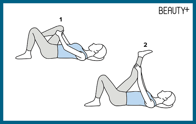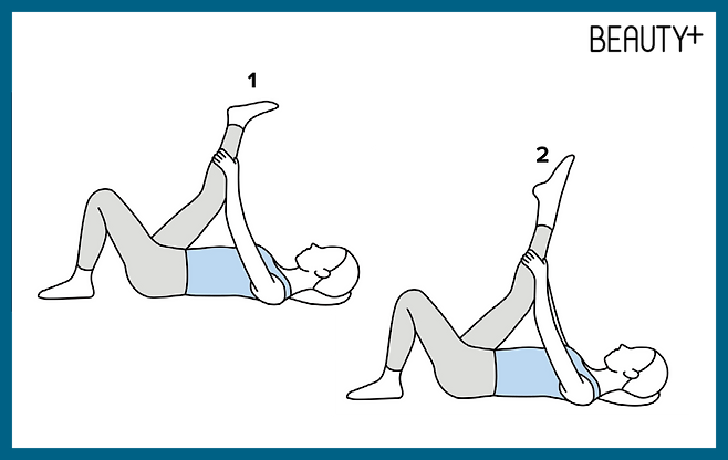 2 구부린 무릎을 가볍게 잡고 가슴 쪽으로 당긴다. 골반이 뒤로 말리지 않게 중심을 유지한다.