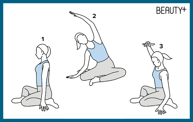1 한쪽 다리는 편안하게 앉은 상태에서 남은 한쪽 다리는 바깥쪽으로 향하도록 앉는 ‘인어 공주’ 자세를 만든다. 이때 허리는 바르게 세워 앉는다.