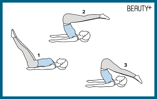 2 숨을 내쉬며 골반을 말아서 머리 뒤쪽으로 다리를 넘긴다.