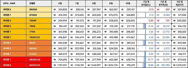 6월부터 10월까지 제품 별 가격 동향은 라이젠 5 APU 8600G(+0.13%), 8700G(-2.14%), 라이젠 5 7500F(+0.34%), 7600(-15.10%), 7700(-3.54%), 7800X3D(-4.48%), 9600(-14.92%), 9600X(-0.61%), 9700X(-8.89%), 9800X3D(-10.77%), 9950X3D(-16.86%)