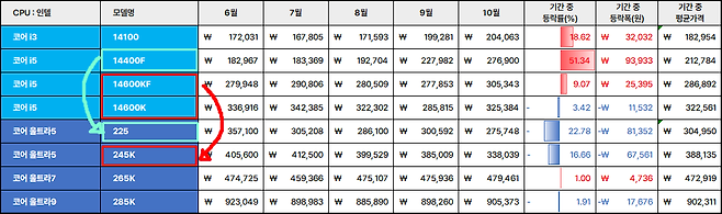6월부터 10월까지 제품별 가격 동향은 14세대 코어 i3-14100(+18.62%), i5-14400F(+51.34%), 14600KF(+9.07%), 코어 울트라5 225(-22.78%), 울트라5 245K(-16.66%), 울트라7 265K(+1.00%), 울트라9 285K(-1.91%)를 기록했다.
